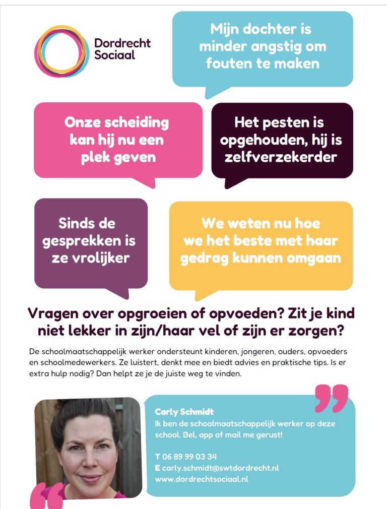 Bij onze schoolmaatschappelijk werker (SMW-er) Carly Schmidt kunt u [leerling en ouder/verzorger] terecht met al uw vragen over opvoeden, opgroeien en andere zaken binnen uw gezin. De SMW’er is een vraagbaak op het gebied van:
